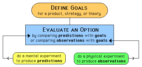 Can we distinguish between science and design on the basis of "three ways to compare" (as shown in the diagram above) by defining science as our comparisons of predictions with observations, and defining design as our comparisons of goals with predictions or observations? Some readers will ask, "Are these distinctions easy to make in every imaginable situation, are they always useful, and do the results agree with every possible interpretation of science and design?" The answer is "of course not" but my advice is to "relax and enjoy this concept for what it is." It is intended to be a perspective, not the perspective. It is a fairly new idea (formulated by me in March 2000, and perhaps earlier by others) that seems worthy of further development. I think it will serve as one useful perspective for analyzing the complex relationships between science and design. When it suggests ideas that are consistent with other ways of looking at science and design, this will be interesting and useful. And when it leads to ideas that don't agree with other perspectives, this will also be interesting and useful, as a stimulation for thinking. This way to think about science will probably seem more useful for those who prefer to define science functionally rather than professionally, who feel comfortable saying "a scientist can do both science and design, and this blending of functions is often a part of doing effective science," rather than insisting that "everything a scientist does should be defined as science." }