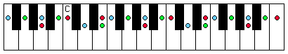 I mark my keyboards with press-on colored dots. To play in another key (besides C), just use the "transposing" feature (which is on most electronic keyboards made by Yamaha or Casio) to shift every note you play up or down by the same amount. For example, you can play a melody in the key of C, punch a button for "+1" transposing, play the same melody, and instantly you're playing in the key of C# with every note automatically increased in pitch by one semitone. And you don't have to learn how to cope with 7 sharps or 5 flats! { This "Music by Color" Improvising System was invented by me in the late-1970s: copyright 1998 by Craig Rusbult, all rights reserved. }