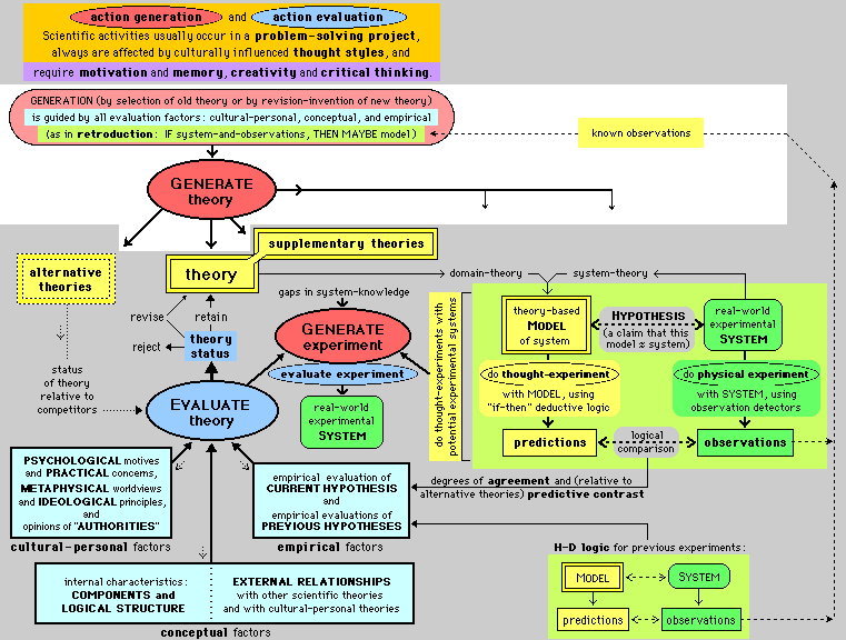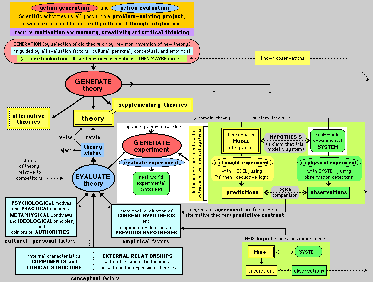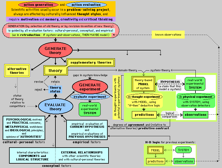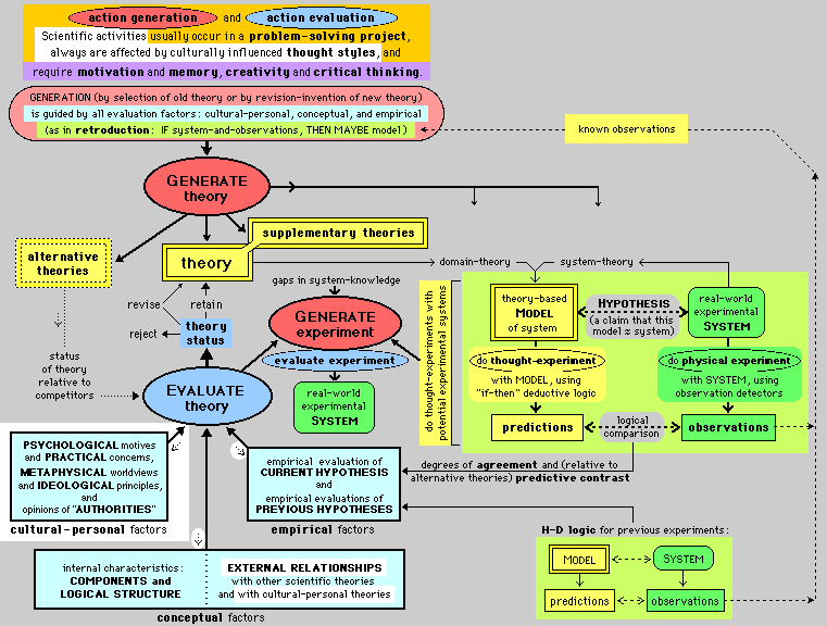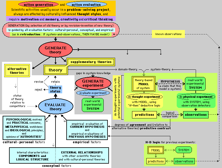 | Theory generation is guided by evaluation factors that are cultural-personal, conceptual, and empirical. There is a close relationship between the generation and evaluation of a theory. { Similarly, the generation and evaluation of an action (such as designing or executing an experiment) are closely related. } |